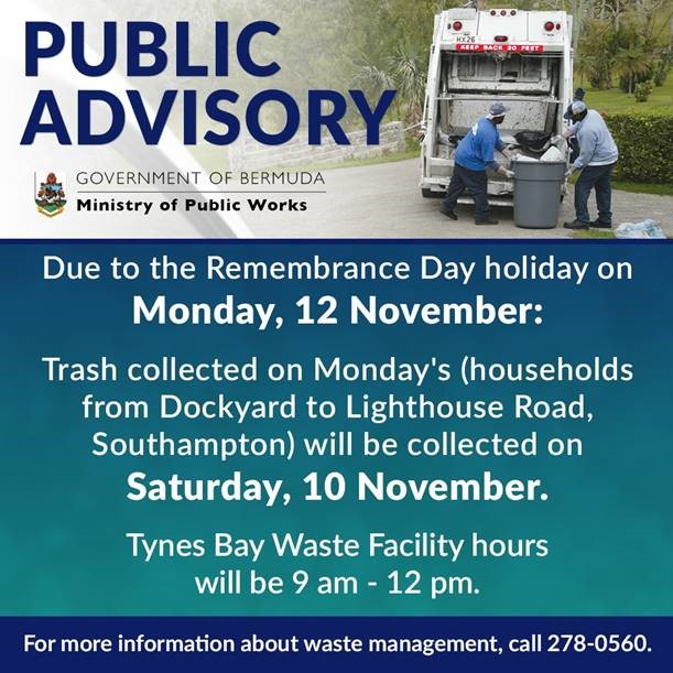 The public holiday waste collection schedule is posted on www.gov.bm/garbage-and-recycling.