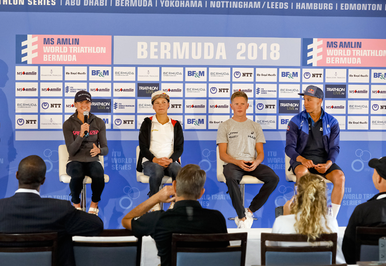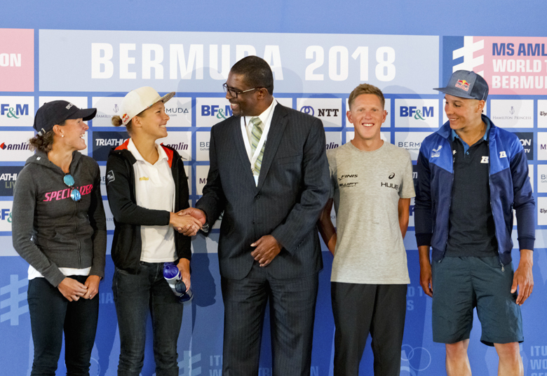 At the MS Amblin World Triathlon Bermuda Elite Athletes press conference today, the Minister of Social Development and Sports the Hon. Michael Weeks JP MP met with four Elite Athletes (Henri Schoeman, Vincent Luis, Flora Duffy and Rachel Klamer) competing in this weekend's World Triathlon Series in Bermuda.