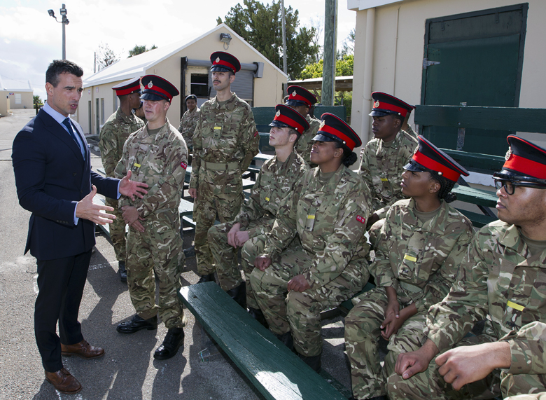 This morning, Premier, The Hon. Michael H. Dunkley, JP, MP, Minister of National Security, Senator the Hon. Jeffery Baron, JP and Junior Minister of Social Development and Sports Nandi Outerbridge, JP,MP visited the 60 volunteer recruits in the Royal Bermuda Regiment at Warwick Camp.