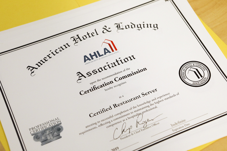 During a brief ceremony at the Ministry Offices, Minister Foggo officially presented seven individuals with their Restaurant Server Certificate and official Pins from the international recognized American Hotel and Lodging Educational Institute.