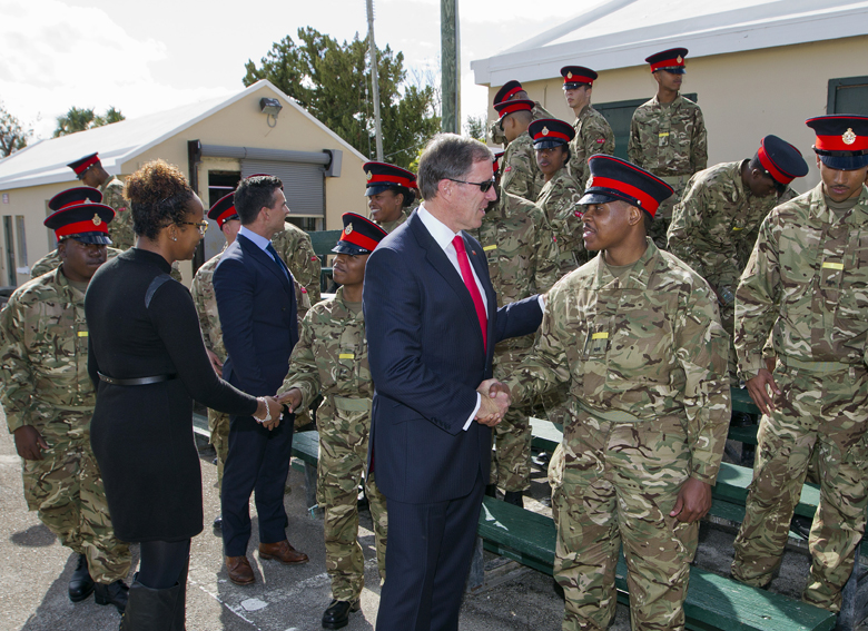 This morning, Premier, The Hon. Michael H. Dunkley, JP, MP, Minister of National Security, Senator the Hon. Jeffery Baron, JP and Junior Minister of Social Development and Sports Nandi Outerbridge, JP,MP visited the 60 volunteer recruits in the Royal Bermuda Regiment at Warwick Camp.